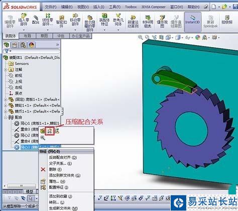 4、如下圖所示,將第三步設置的配合關系壓縮,釋放棘輪和棘爪的旋轉自由度,為運動仿真做準備。