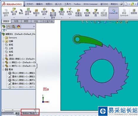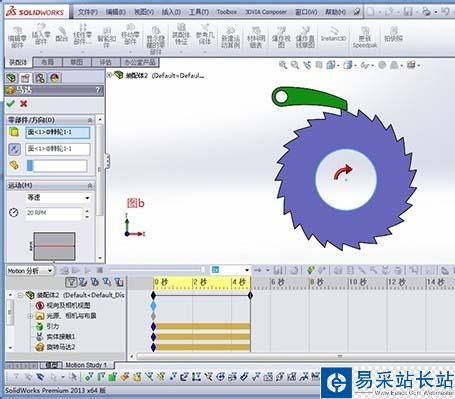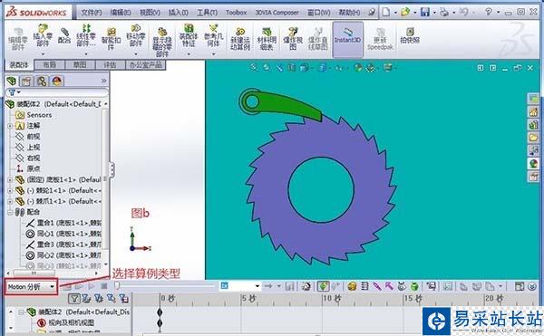 1、在已經開啟SolidWorks Motion插件的情況下,如下圖a所示點擊“Motion Study1”。在“算例類型”一欄選擇“Motion分析”,如下圖b所示: