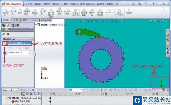 2、點擊如下圖a所示的青蘋果圖標,為裝配環境添加引力;如下圖b所示,將底板的一條豎直邊線設置成引力方向的參考線,將引力方向切換到豎直向下。
