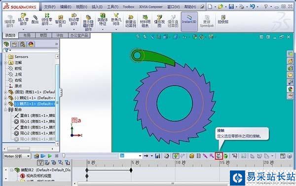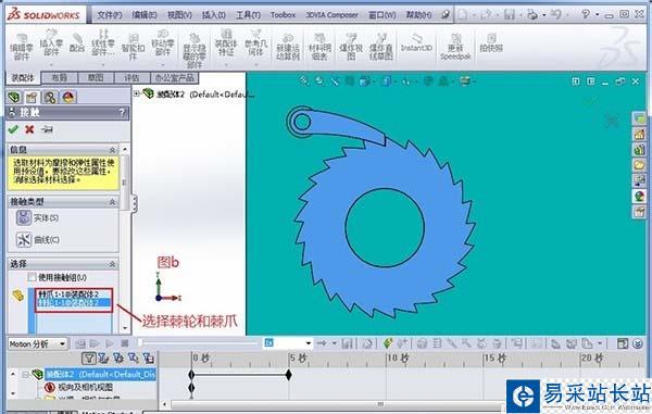 3、點擊如下圖a所示的凸輪圖標,在棘輪與棘爪之間設置接觸關系;如下圖b所示,選中棘輪和棘爪,點擊確定即可。