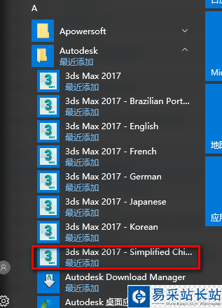 1、打開開始菜單,找到Autodesk的位置,選擇簡體中文,雙擊