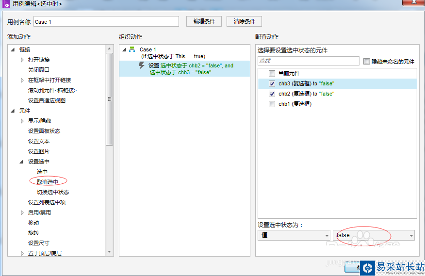 6、在左側動作中單擊“取消選中”動作,然后在右側中選擇chb2,chb3元件,如下圖所示,點擊確定退出用例編輯窗口,這時候已經可以初步顯示效果了,一旦選擇了chb1,chb2和chb3就會被取消選中,僅針對chb1已經完成單選效果的設定了。