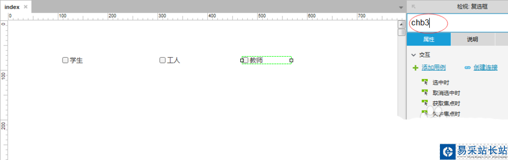3、在頁面編輯區對三個復選框的內容進行編輯,并對三個復選框分別進行命名,便于后續選中事件的定義。本例中分別對三個復選框命名為chb1、chb2、chb3