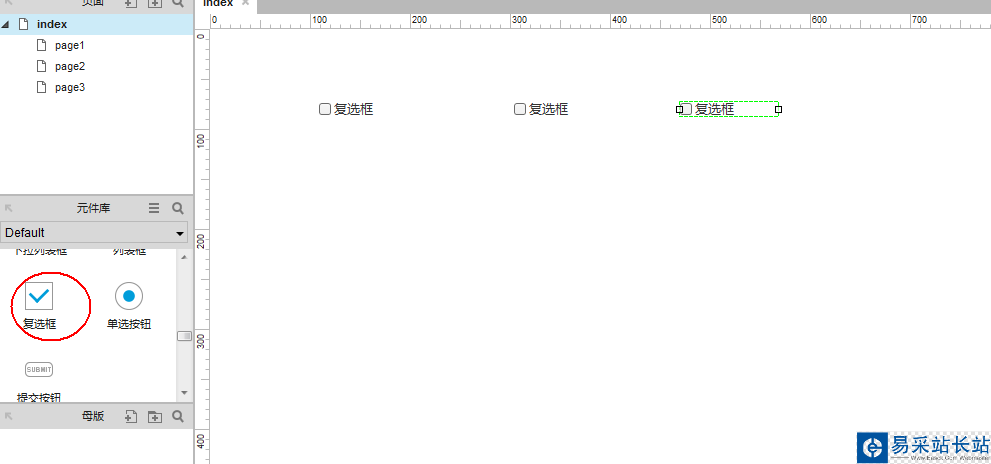 2、新建一個空白頁面,從左側元件庫中拖動3個復選框到空白頁面,做為示例使用,實際過程中請根據自己的實際需求進行設計。