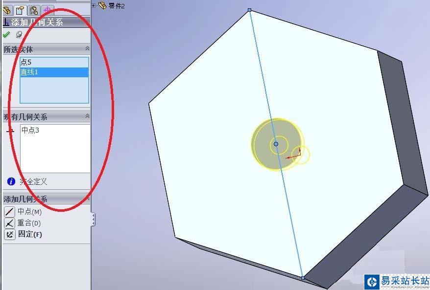 8、通過添加一系列的約束,最終確定孔的位置