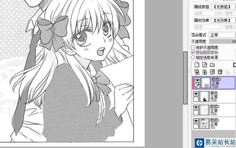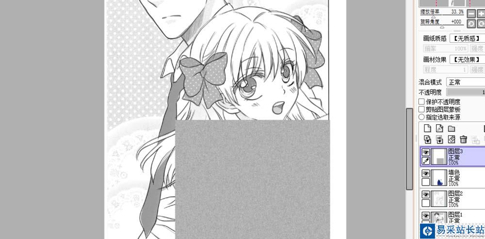 9、此時調整一下圖層的順序把線稿放在最上層,可以看出網點紙已經覆蓋剛剛涂色的地方了。