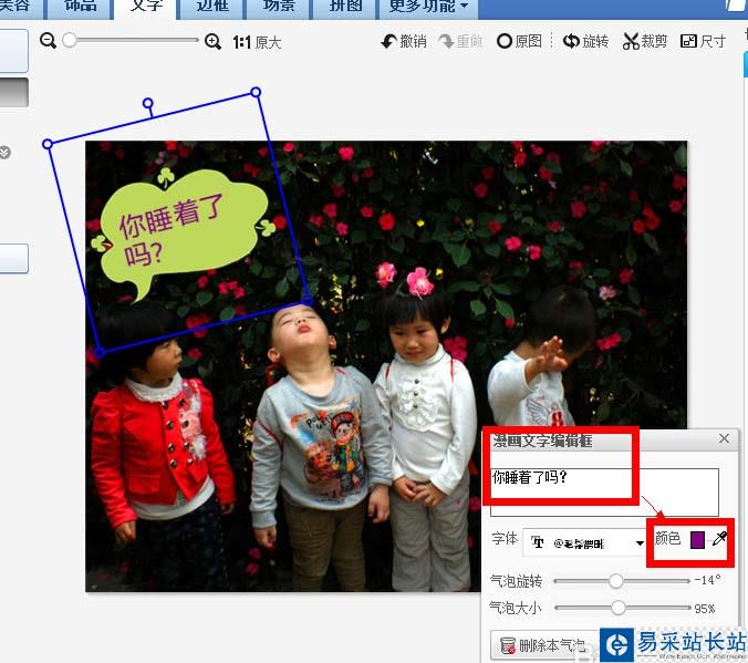 5、在文本編輯框里打上文字,選擇文字的顏色,調整氣泡大小,右鍵選擇合并。