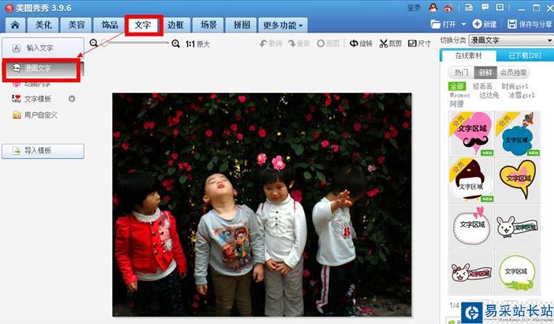 3、點擊最上排的“文字',然后選擇左邊的”漫畫文字“。