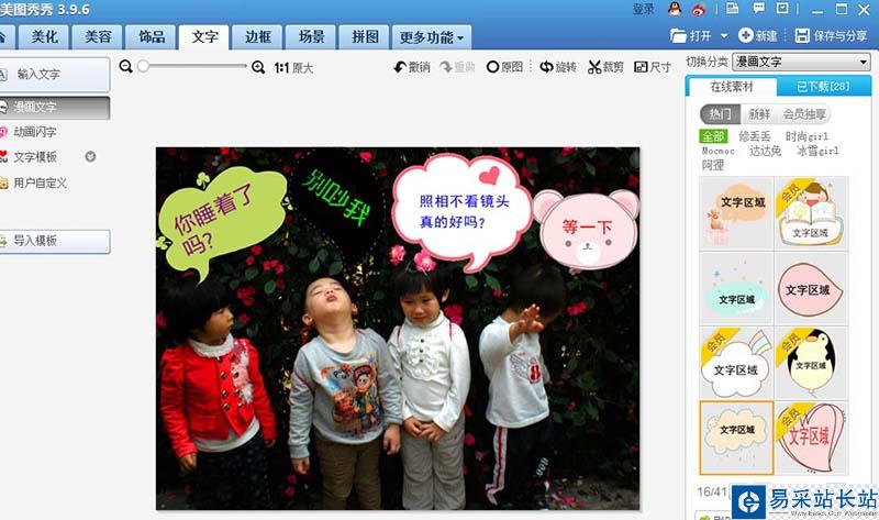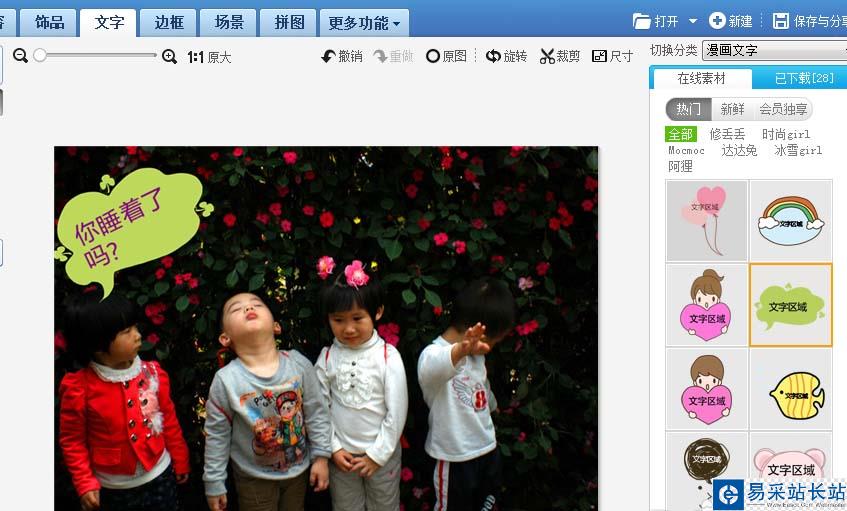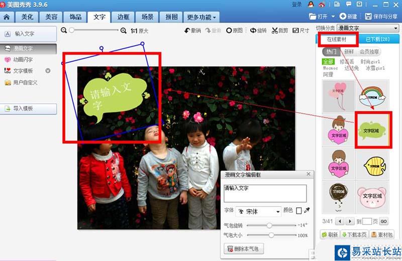 6、人物多的圖片可以多添加幾個會話氣泡,在右邊在線素材里選擇氣泡,和第四、第五的步驟一樣,可選擇不同款的氣泡。