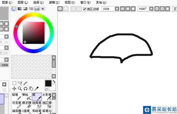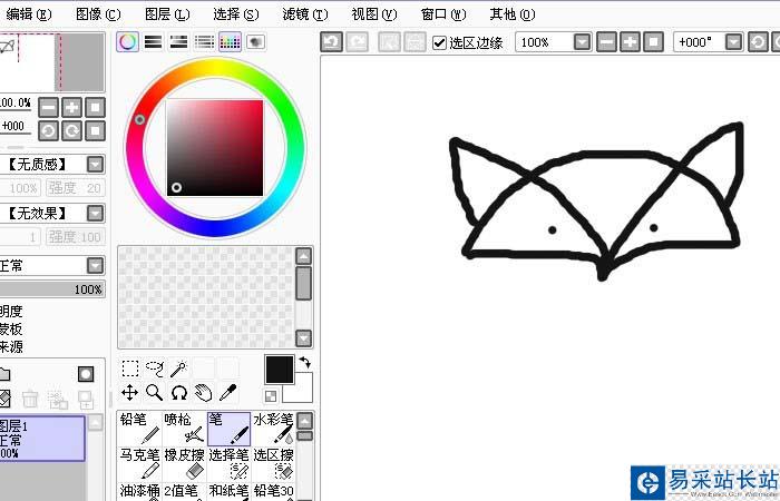 2、鼠標(biāo)左鍵單擊【確定】按鈕后,在SAI軟件的繪圖區(qū),可看到白色的畫布,用鉛筆工具,選擇一個(gè)顏色,如黑色,然后在畫布上畫可愛(ài)的小狐貍的頭,如下圖所示。