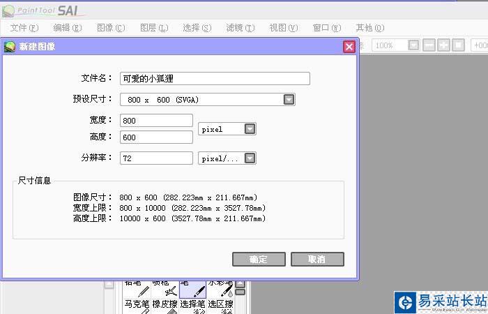 1、打開(kāi)SAI軟件后,鼠標(biāo)左鍵在菜單【文件】>>【新建】單擊,新建一個(gè)SAI文件,在新建的文件窗口上,可設(shè)置文件的大小,并重新命名,這里取名可愛(ài)的小狐貍,如下圖所示。