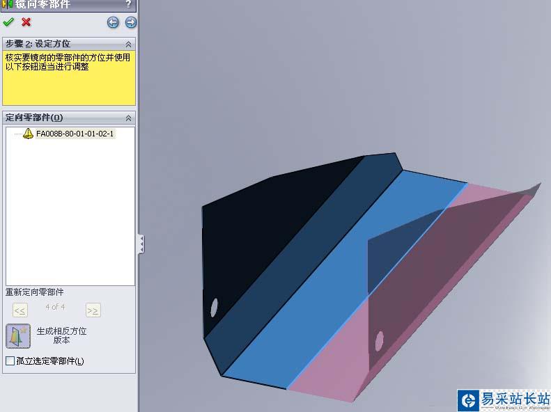 2、利用線性零部件下鏡像零件命令完成鏡像。在左側配置欄內有方向、 方位等條件設置,可以設定出符合你要求的鏡像零件。