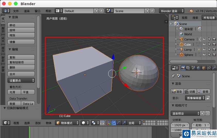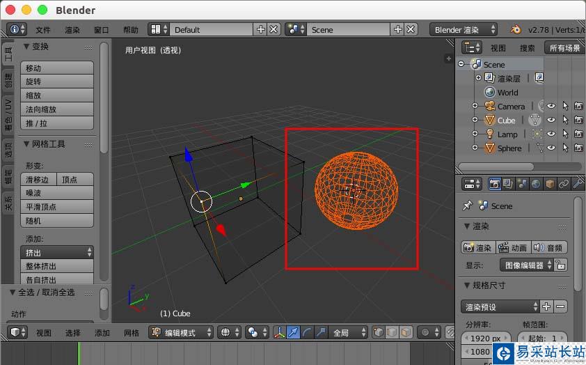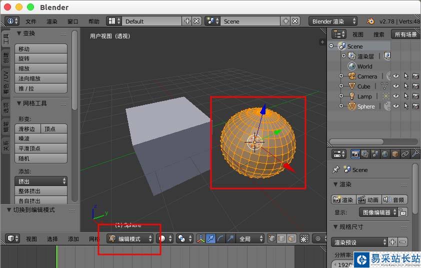 4、進(jìn)入編輯模式,我們發(fā)現(xiàn)只能編輯立方體,球體是橙色無(wú)法進(jìn)行編輯,這是因?yàn)榍蝮w不是激活狀態(tài)。