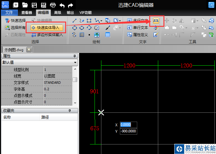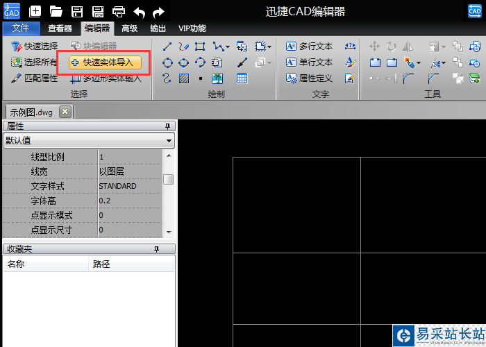 2、打開CAD圖紙文件之后,切換到“編輯器”,若要連續使用某個繪圖工具,那么首先需要點擊選擇“快速實體導入”。