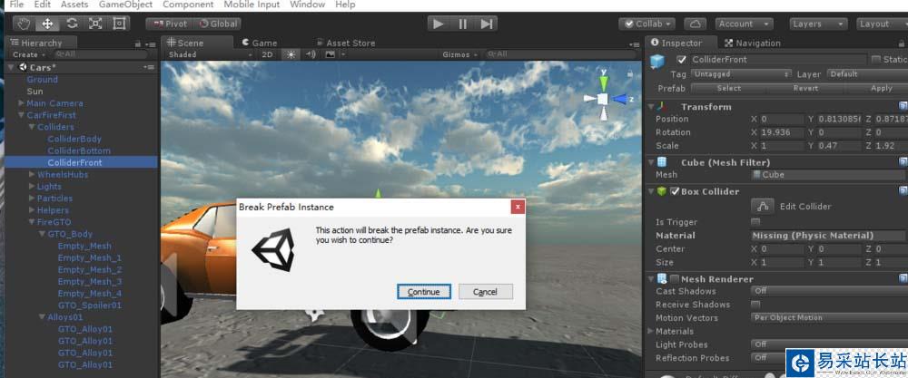 2、然后我們對這個游戲對象做一些修改。當我們試圖刪去子步件時,提示是否要Break Prefab Instance, 我們繼續。(也可以直接從GameObject菜單下找到Break Prefab Instance)