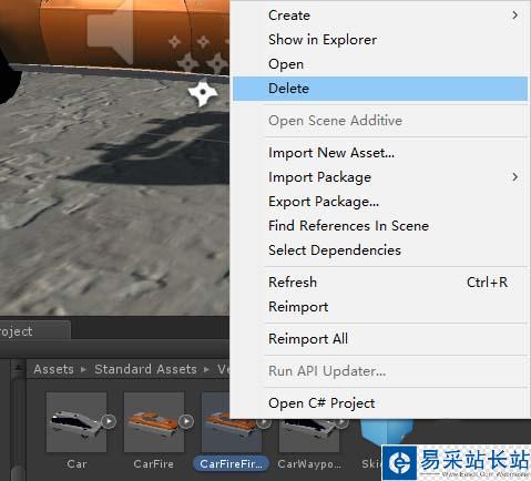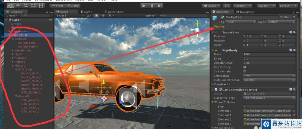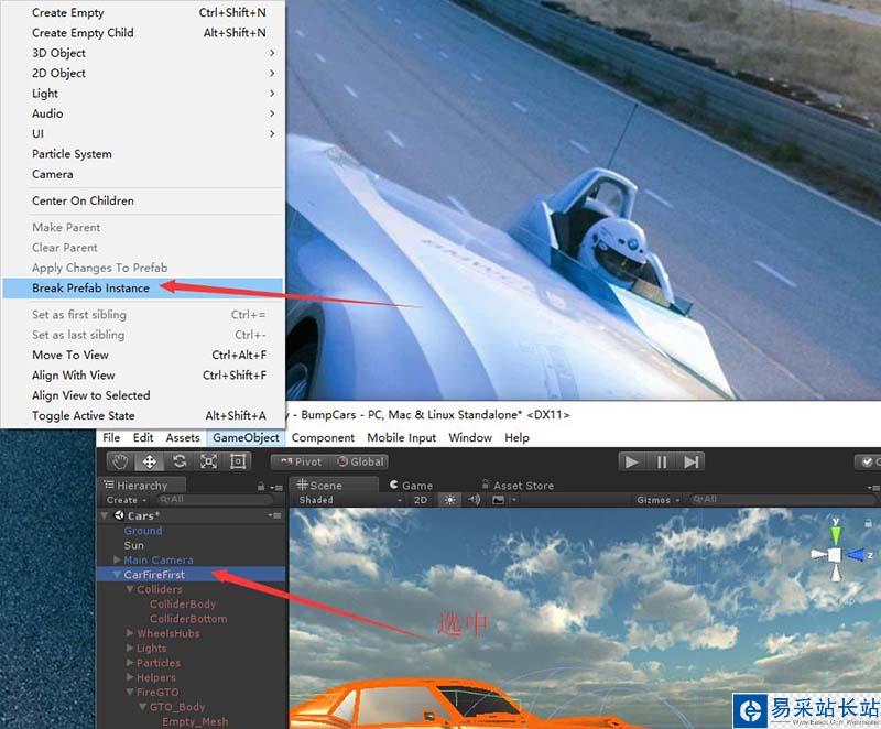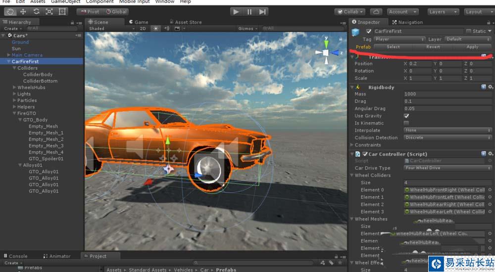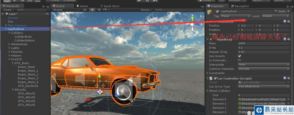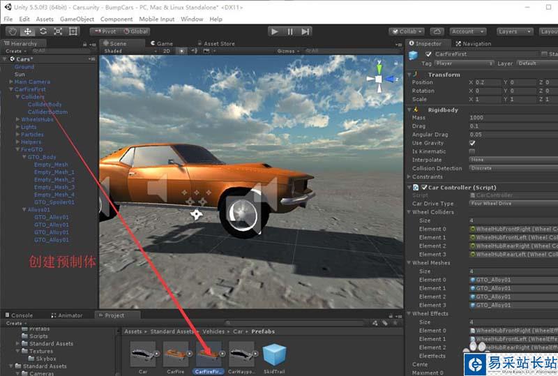 1、首先,為了演示,我們使用一個CarFire預制體拖動到場景中,重命名為CarFireFirst.
