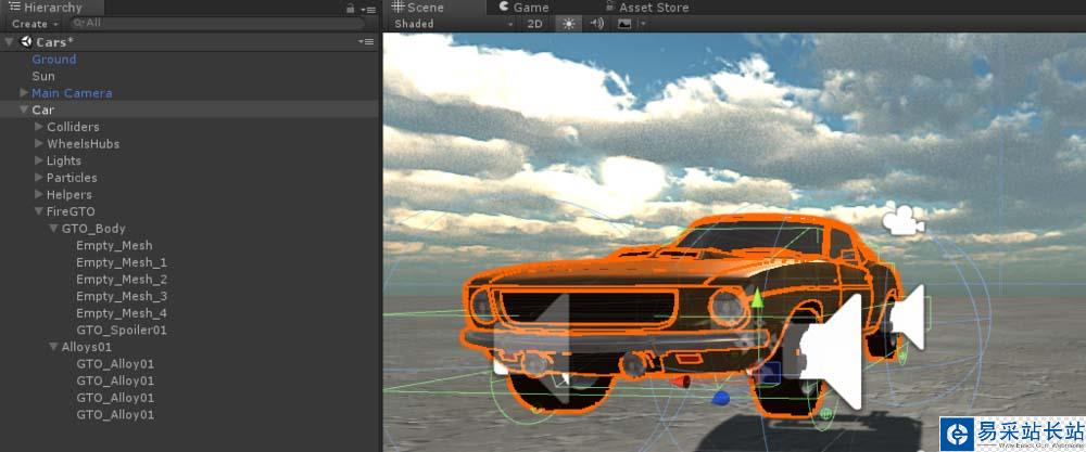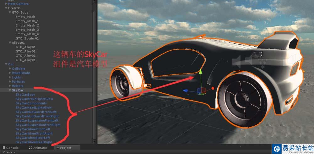 5、展開Car對象,我們看到其子對象SkyCar是汽車模型部分。