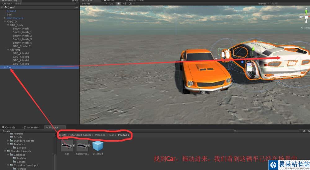4、找到Assets->Standard Assets->Vehicles->Car->Prefabs, 把標準資源包中的Car預制體拖動到場景中。重置其Transform組件,如圖。