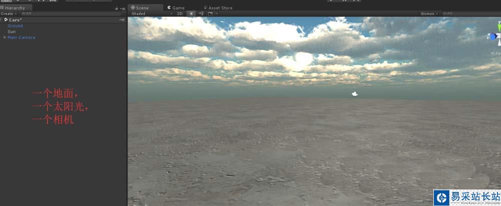 1、首先新建場景,建立一個地面(Box),一個太陽光(Directional Light),一個Main Camera
