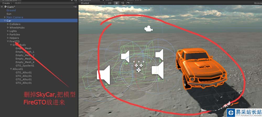 6、刪去SkyCar子對象,把我們的汽車模型CarFire拖進來。
