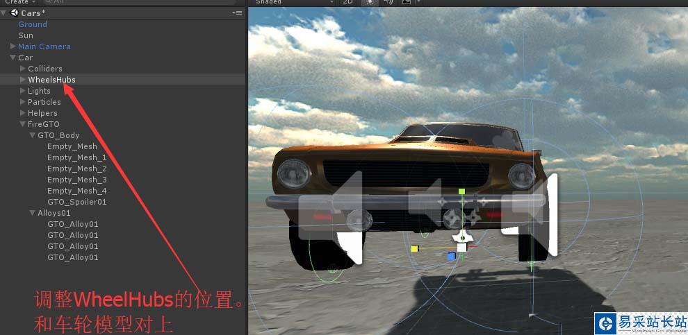 8、選中WheelHubs, 根據需要調整里面四個輪胎碰撞體的位置,盡量與輪胎模型重合。