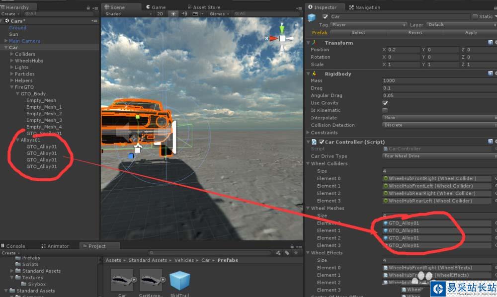 9、然后再把四個輪胎模型,賦值到Car的Car Controller腳本組件的四個Wheel Meshs上面。大功告成!汽車可以開動了。