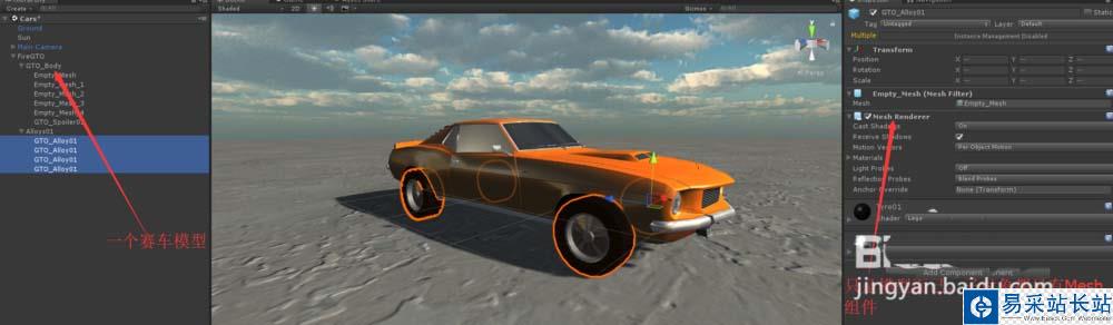 2、把汽車模型導入到Unity中,如圖所示。其每個子對象都只有Mesh Render組件(是單純的模型)這個模型有幾個車體部件和四個輪子模型組成。