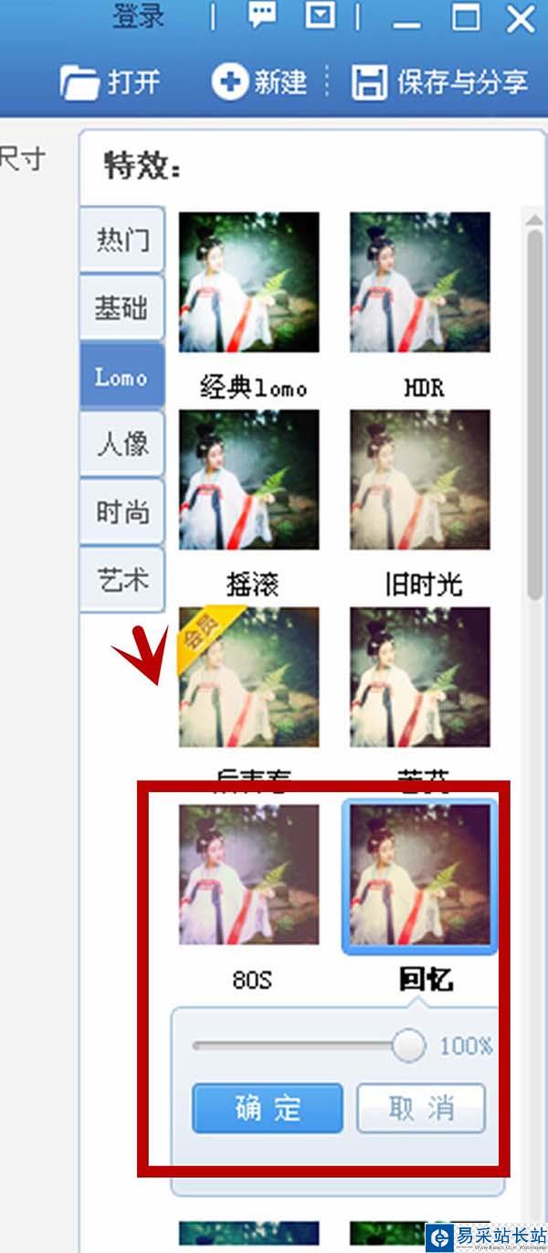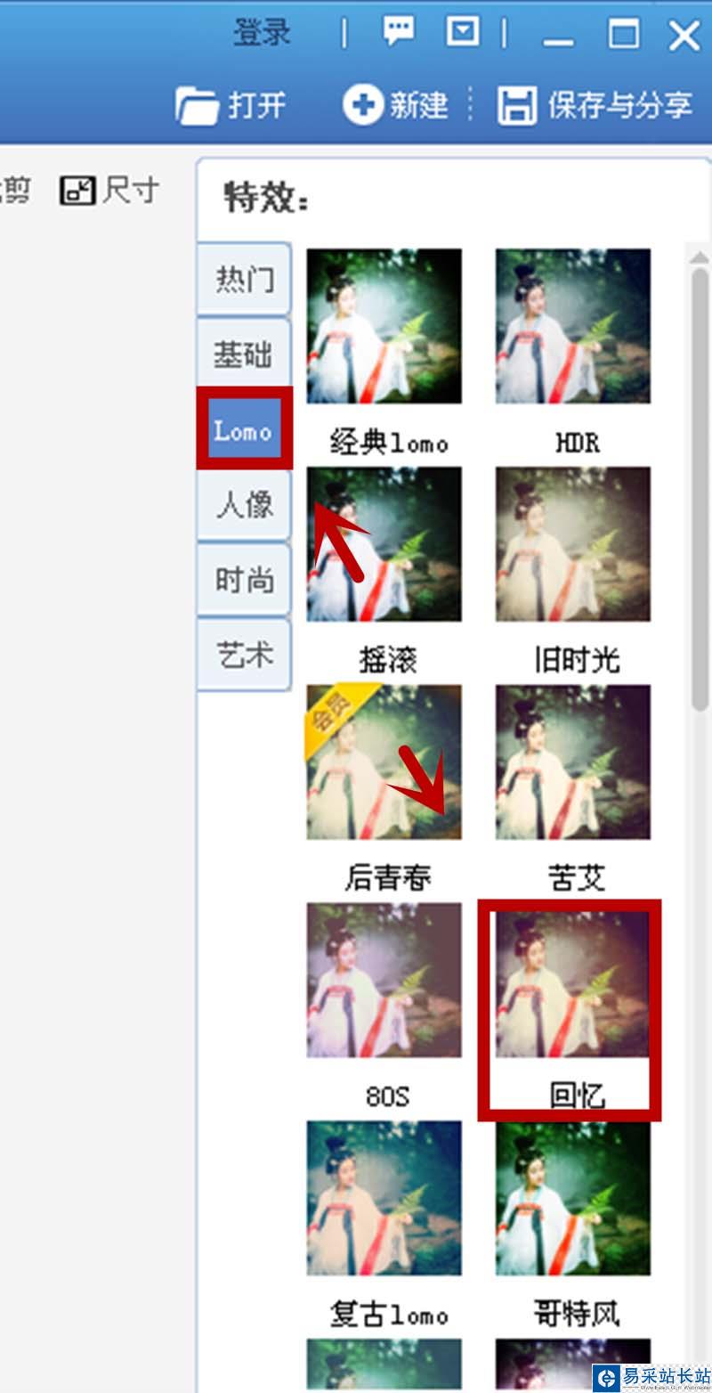 7、在【特效】中,選擇【Lomo】中的【回憶】。