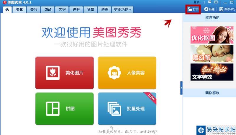 2、在美圖秀秀操作頁面上,單擊【打開】。