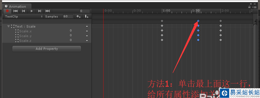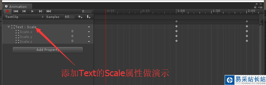 創建Anim文件后,點擊Add Property, 添加Text的Scale屬性,準備為該屬性添加動畫。
