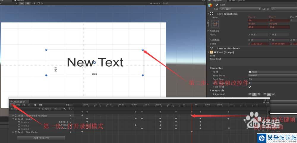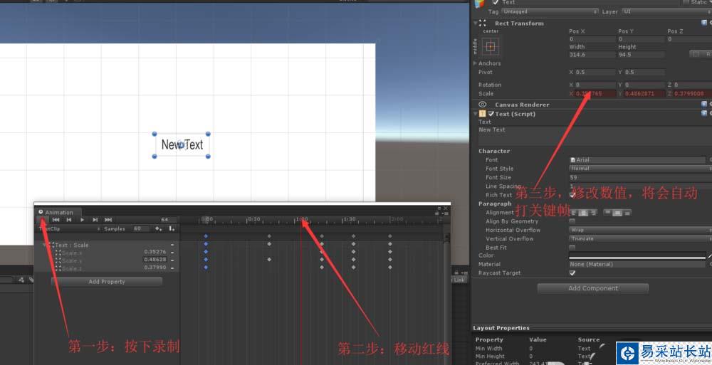 按下錄制按鈕,在上面的時間條上單擊,移動紅線,然后在左邊層級面板選中Text,然后直接在Scene面板中修改Text的尺寸/位置,我們看到對應屬性自動被添加到列表并被打上關鍵幀。