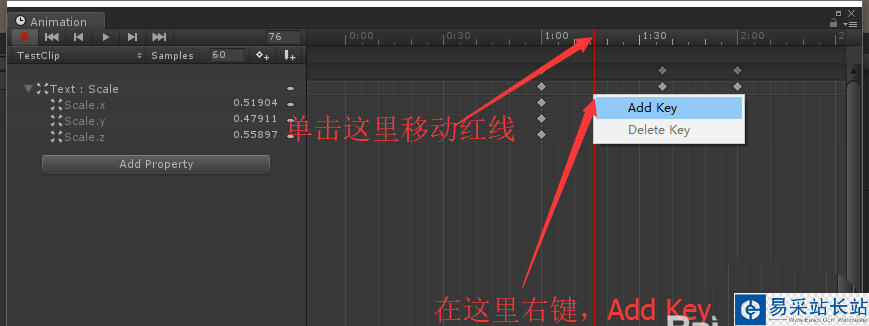 在上面的時間條上單擊,移動紅線,然后在面板中右鍵,Add Key,在紅線處添加關鍵幀。