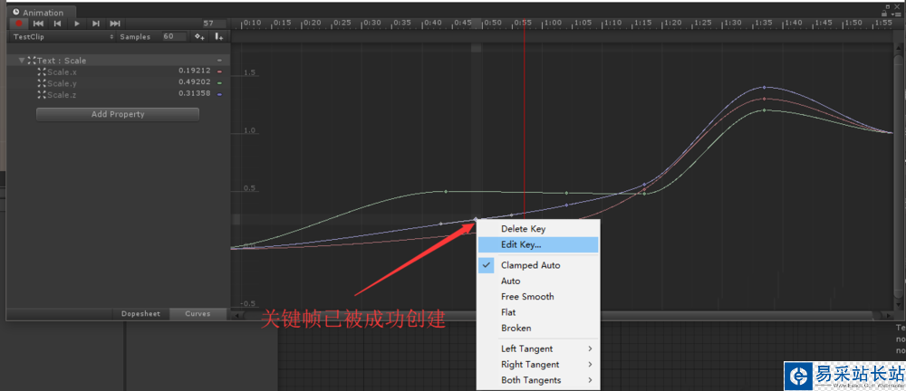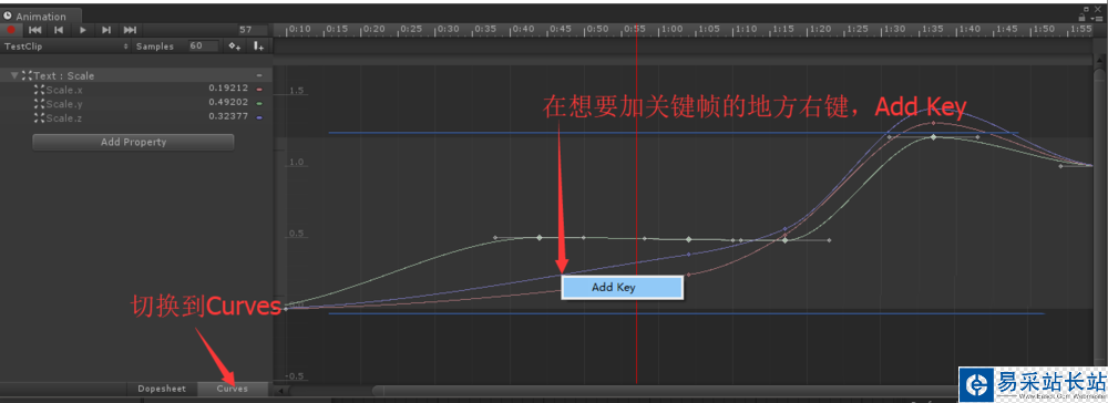 切換到Curves面板,然后在有邊的曲線編輯器里,在想要打關鍵幀的地方右鍵,Add Key, 就可以打上關鍵幀。在曲線編輯器里還可以微調動畫效果。