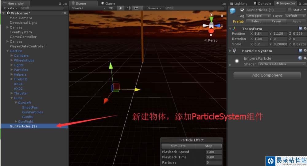 1、首先我們新建一個空游戲對象,給它建立一個ParticleSystem組件。