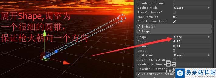 3、展開Shape,把粒子發射裝置的形狀調整成一個很細的圓錐,保證槍火的方向和位置固定。