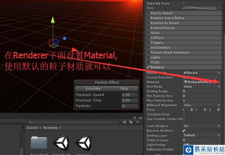 5、在最下面的Renderer里面設置槍火的材質。其實標準材質包的默認粒子材質就可。最終效果如圖。