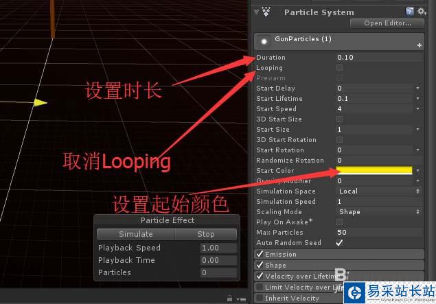 2、展開主面板。設置時長0.1s, 因為槍火的存在時間本來就很短。取消Looping的勾選,因為槍火只射一次。設置起始顏色為黃色。