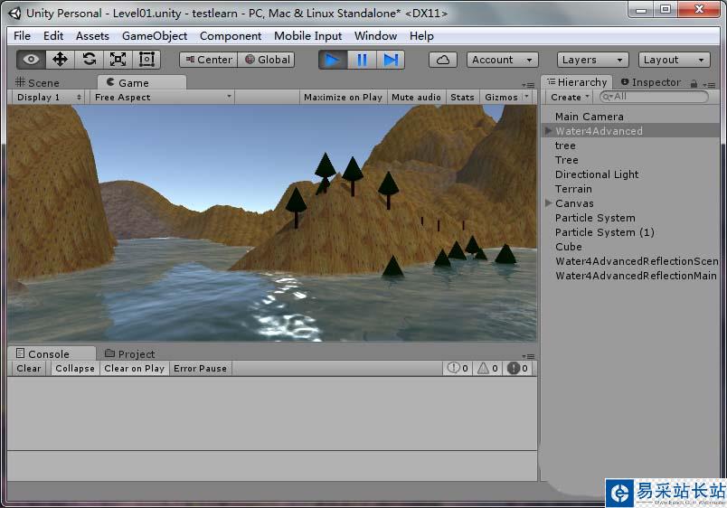 6、在“Water4”文件夾的“Prefabs”中“Water4Advanced”或“Water4Simple”同樣添加到場景中,我們會得到海洋的洋面一樣的效果。