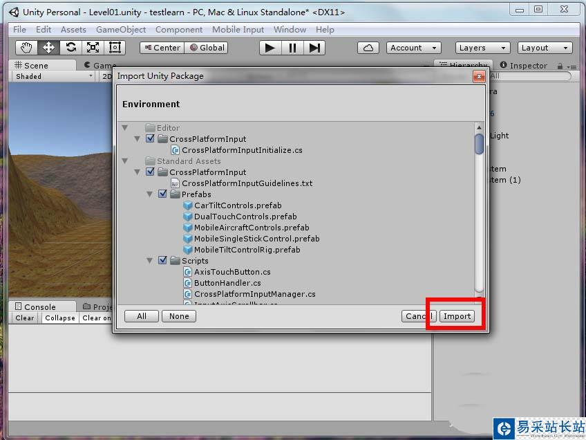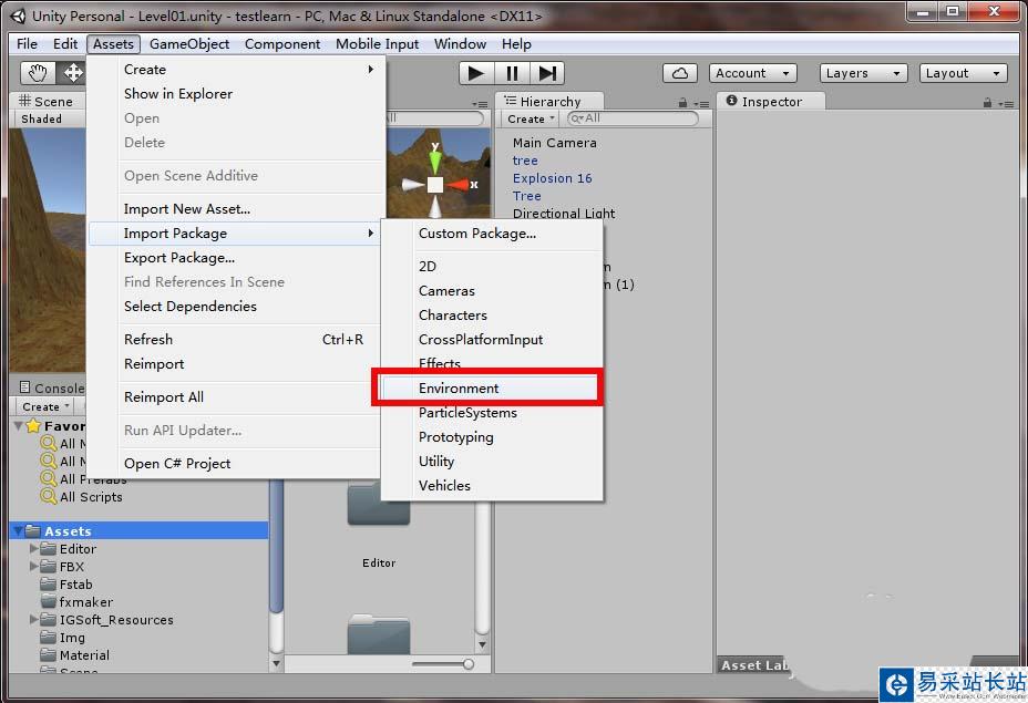 1、在unity3d菜單選擇“Assets”--“Import Package”--“Environment”。