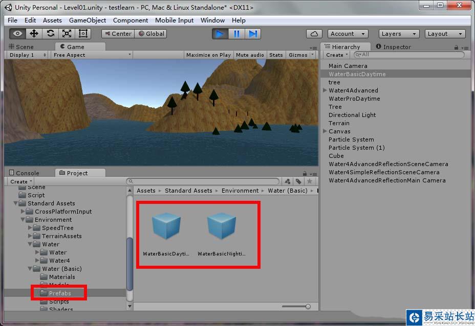 7、打開“Water(Basic)”文件夾在“Prefabs”中把“WaterBasicDaytime”或“WaterBasicNightime”添加到場景中可以得到波光粼粼的水面效果。