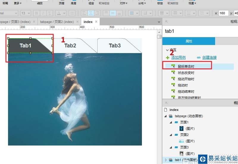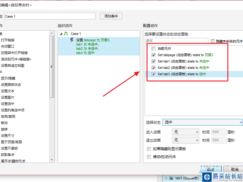 9、根據圖示,設置tab1/tab2/tab3的交互事件,添加思路:點擊tab1設置 tab1狀態為選中,其他為非選中,設置tabpage為頁面1,依次類推,進行設置:
