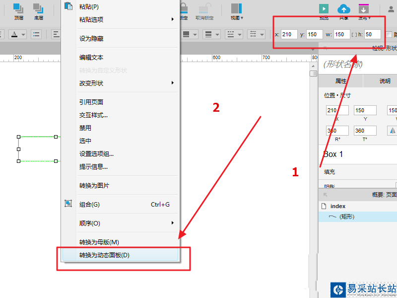 2、設置元件大小,并在選中元件后右鍵,將元件轉換為動態面板:詳細見下圖