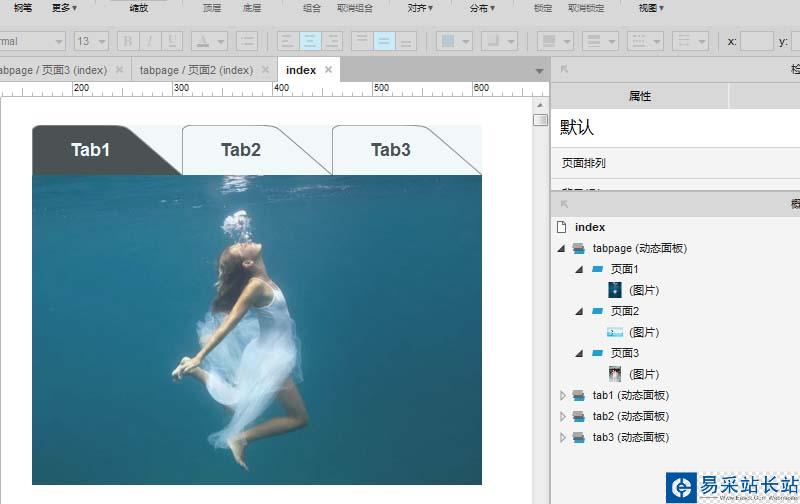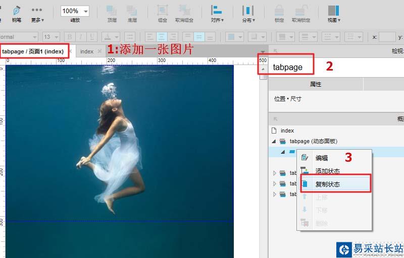 7、再添加一個動態面板,置于選項卡的下方,在狀態1中添加一個圖像元件,并添加圖像。元件命名為:tabpage,然后復制狀態兩份,總計三份: