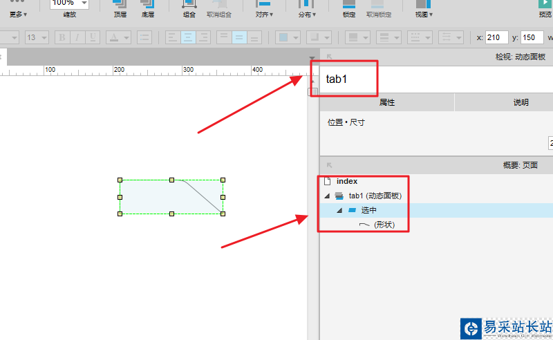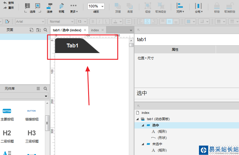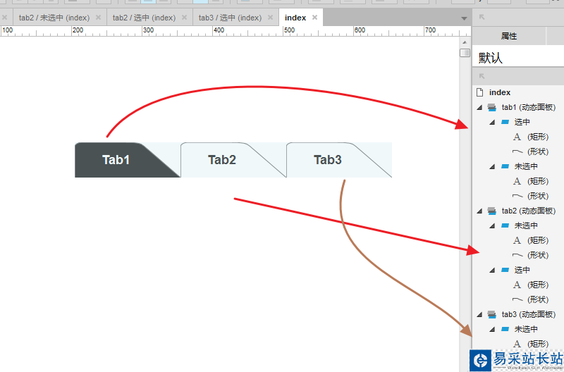 3、按照圖示,對元件進行命名,狀態命名操作,名稱分別為 tab1、選中