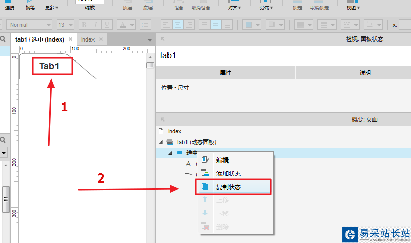 4、進入選中狀態后,添加一個文本,設置為:tab1,然后選中狀態,右鍵進行“復制狀態”操作: