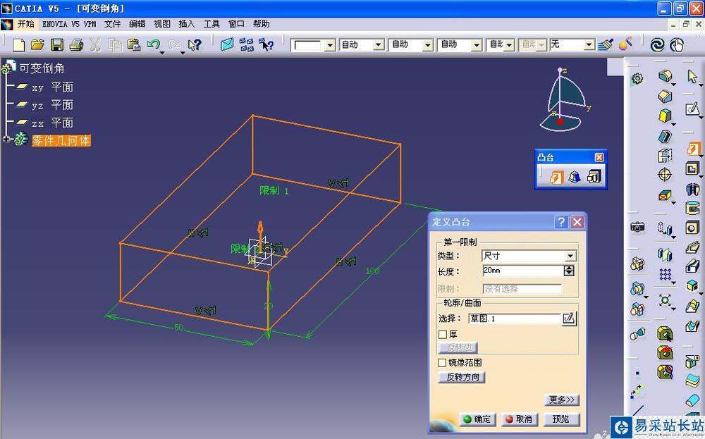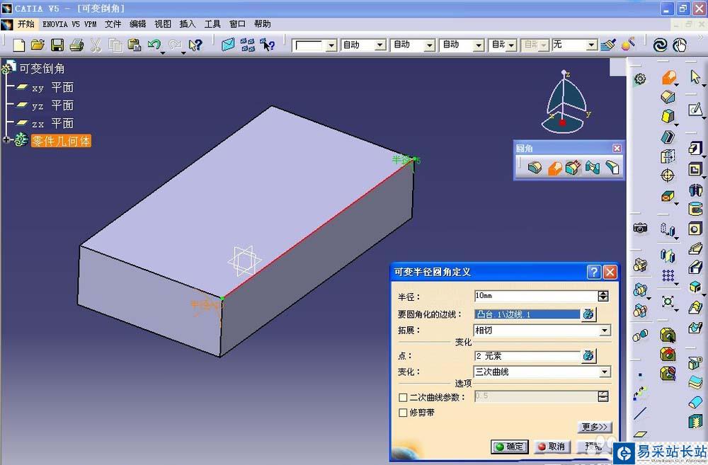 4、在右側(cè)工具欄中點(diǎn)>凸臺(tái)命令,生成一個(gè)長(zhǎng)方體,并找到>可變半徑圓角命令,鼠標(biāo)左鍵單擊,進(jìn)入命令對(duì)話框,半徑設(shè)置為5mm,將鼠標(biāo)移動(dòng)至圖形區(qū),在橙色尺寸上左鍵雙擊;