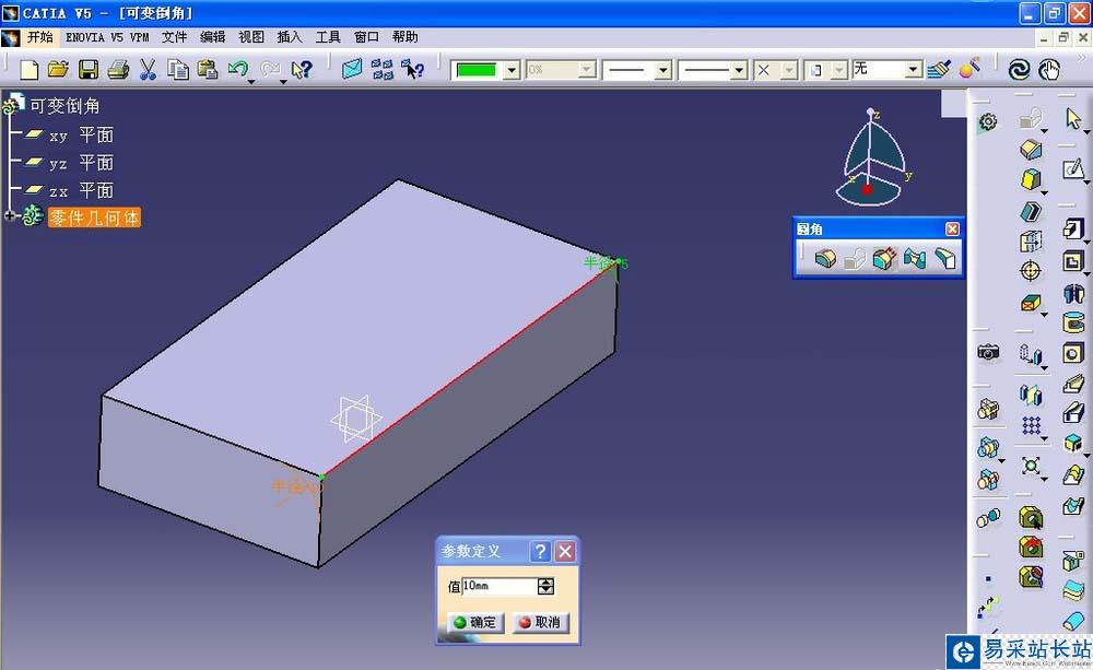 5、彈出>參數(shù)定義對(duì)話框,將尺寸更改為10mm,單擊確定按鈕,回到可變半徑圓角命令對(duì)話框;