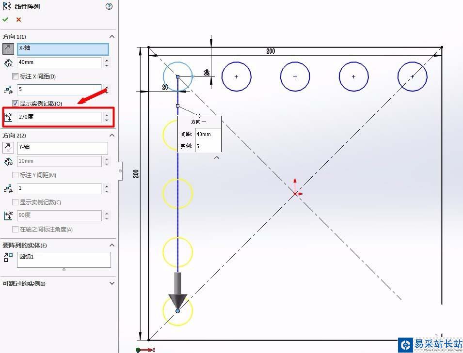 5、若要延上下方向陣列,需要將旋轉(zhuǎn)角度設定為90度或270度,這樣陣列就會沿著上下方向陣列