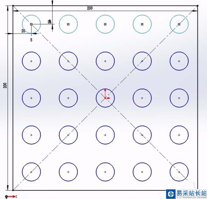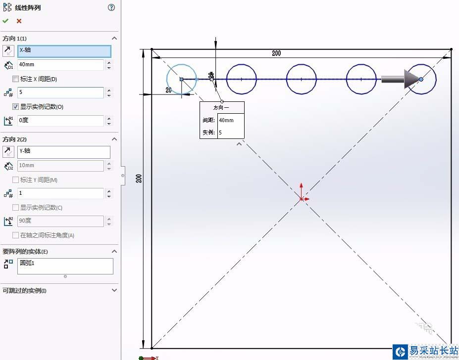 4、點擊上方的對勾,既得出右側(cè)的陣列圖形(該陣列僅是延X軸方向陣列);