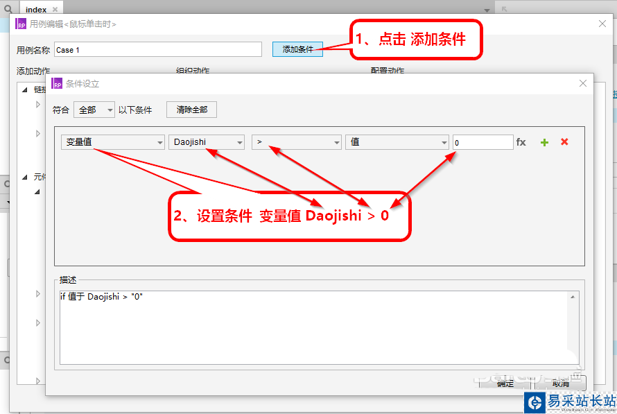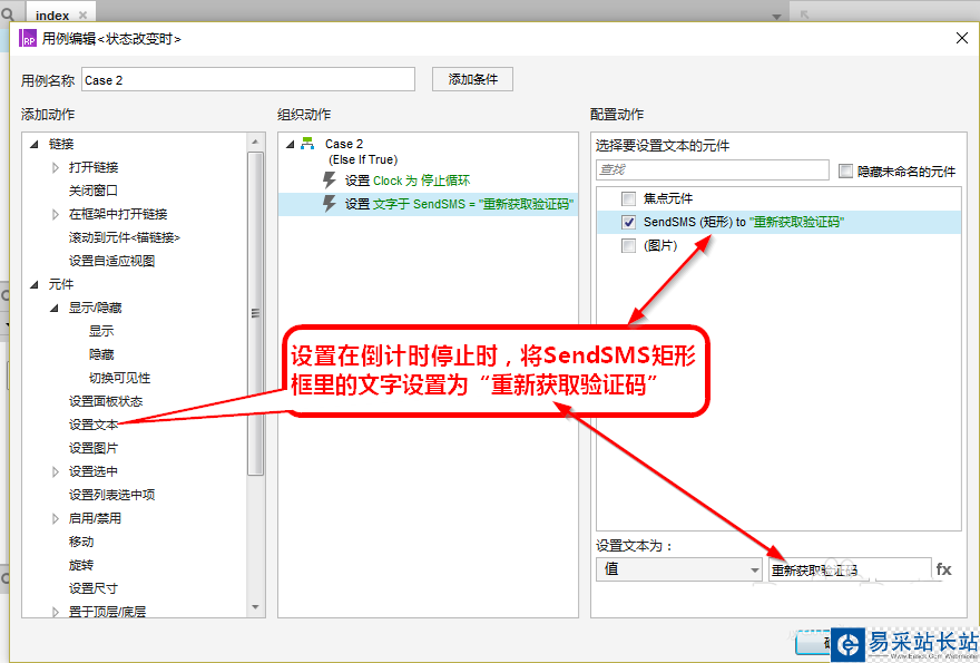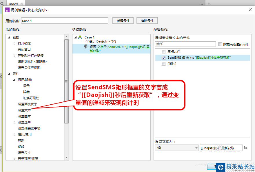 6、設(shè)置動態(tài)面板Clock“狀態(tài)改變時(shí)”事件,新增條件在變量Daojishi>0的情況下,設(shè)置矩形框SendSMS里文字變更為“Daojishi秒后重新獲取”。